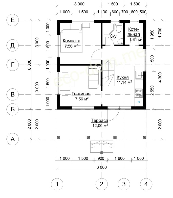 Высота стен первого этажа 3 метра.