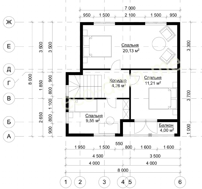 План схема Проект дома из бруса 8х8 № ДБ-62