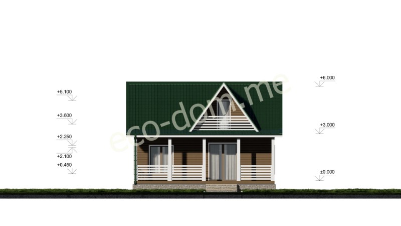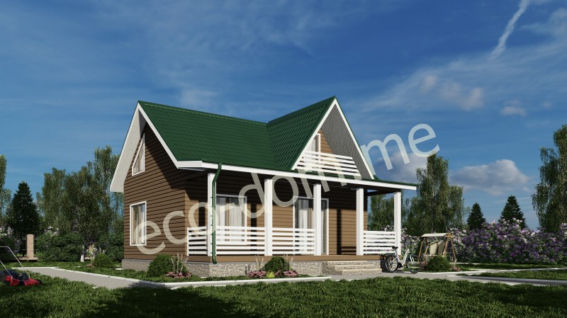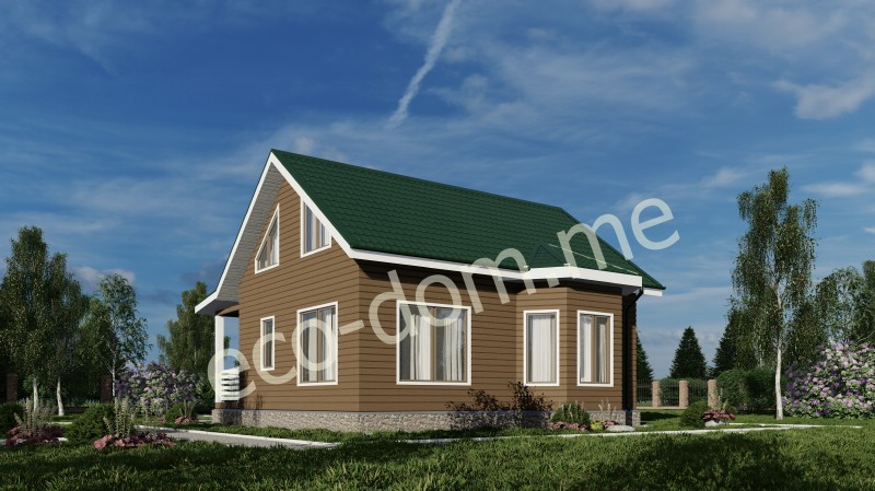 Небольшой, с крепко сбитым планом загородный дом может использоваться как для постояного проживания, так и в качестве вспомогательного сооружения в период возведения основного коттеджа. Небольшие габариты позволяют разместить его и на садовом участке. Центральным местом в доме является двусветная столовая-гостиная с печью-камином. Отсутствие подвального помещения предполагает возведение дома практически на любых грунтах.