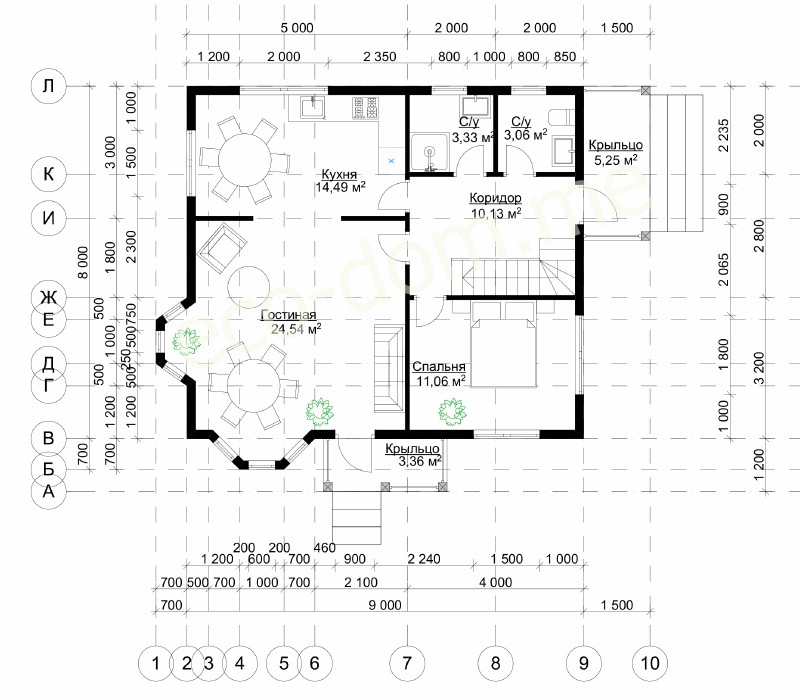 План схема Проект дома из бруса 8х9 № ДБ-74
