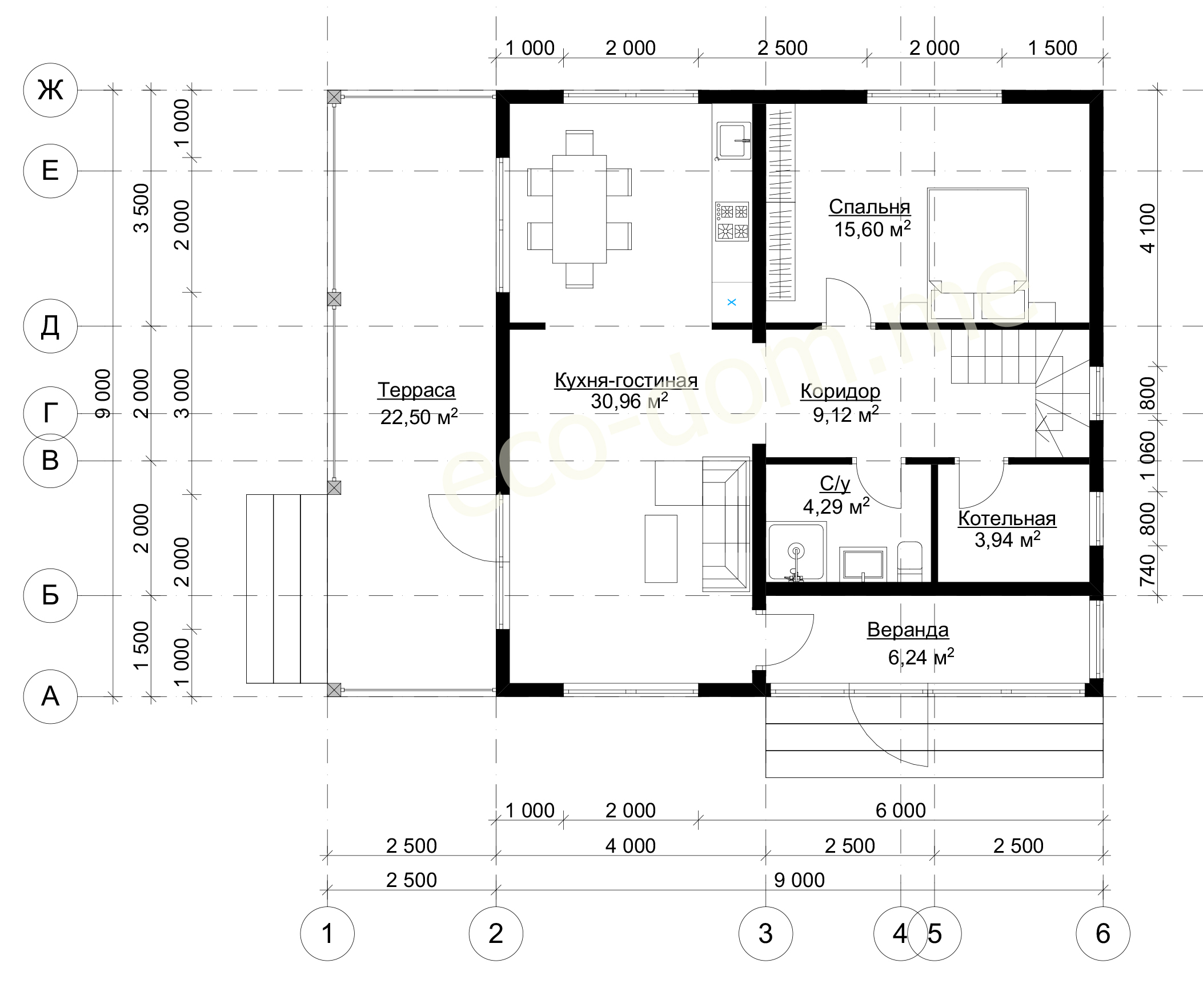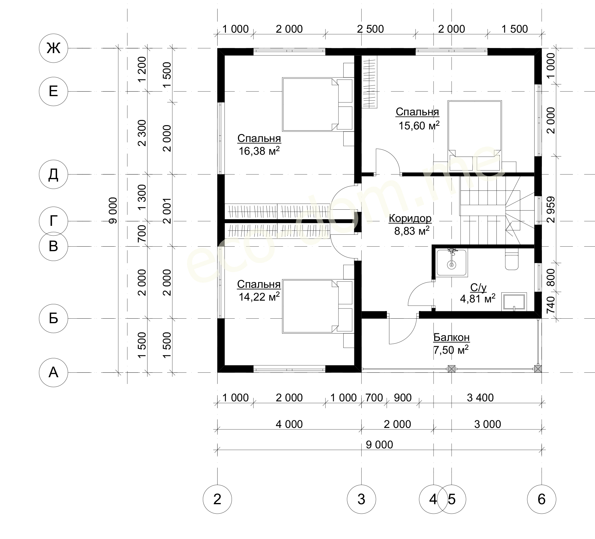 План схема Проект дома из бруса 9х9 № ДБ-96