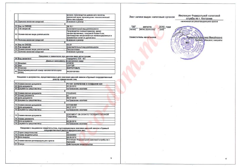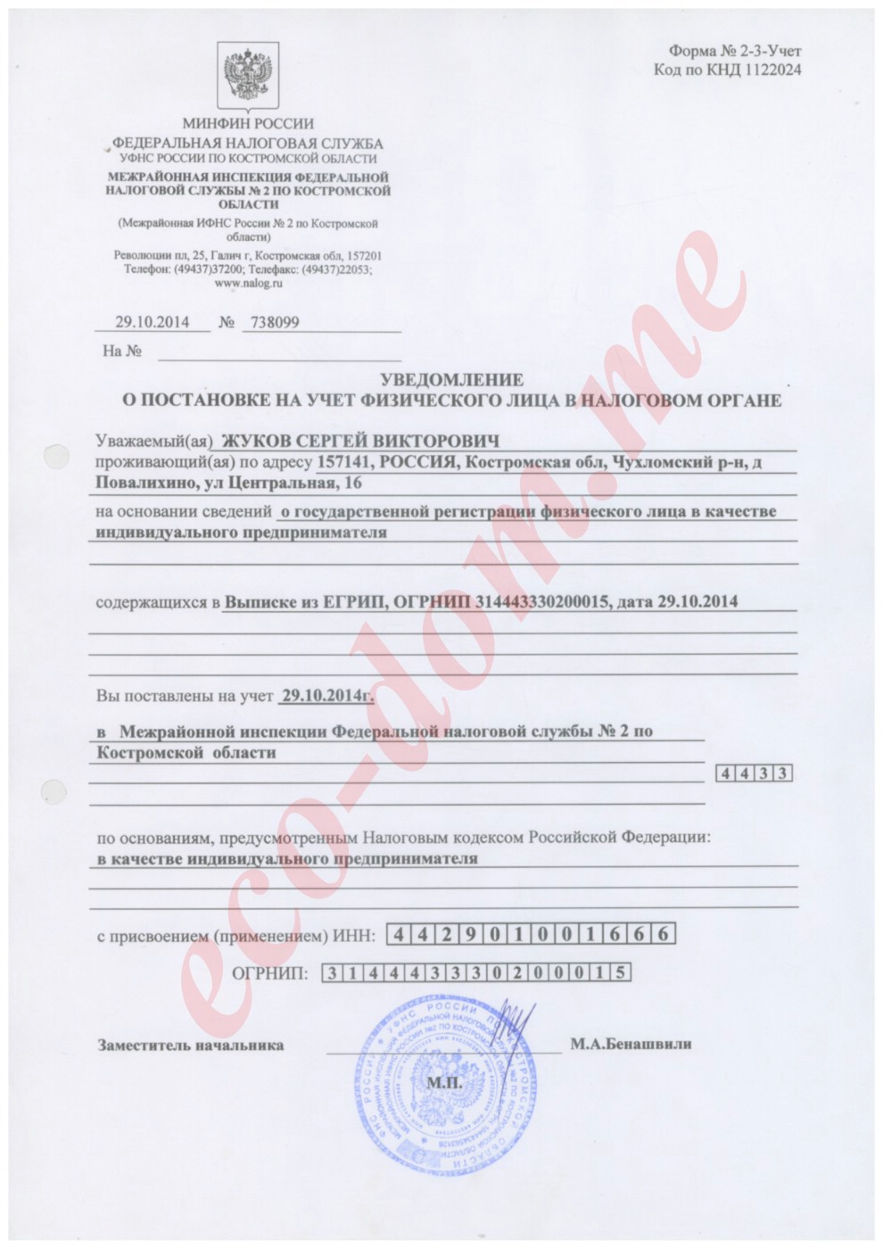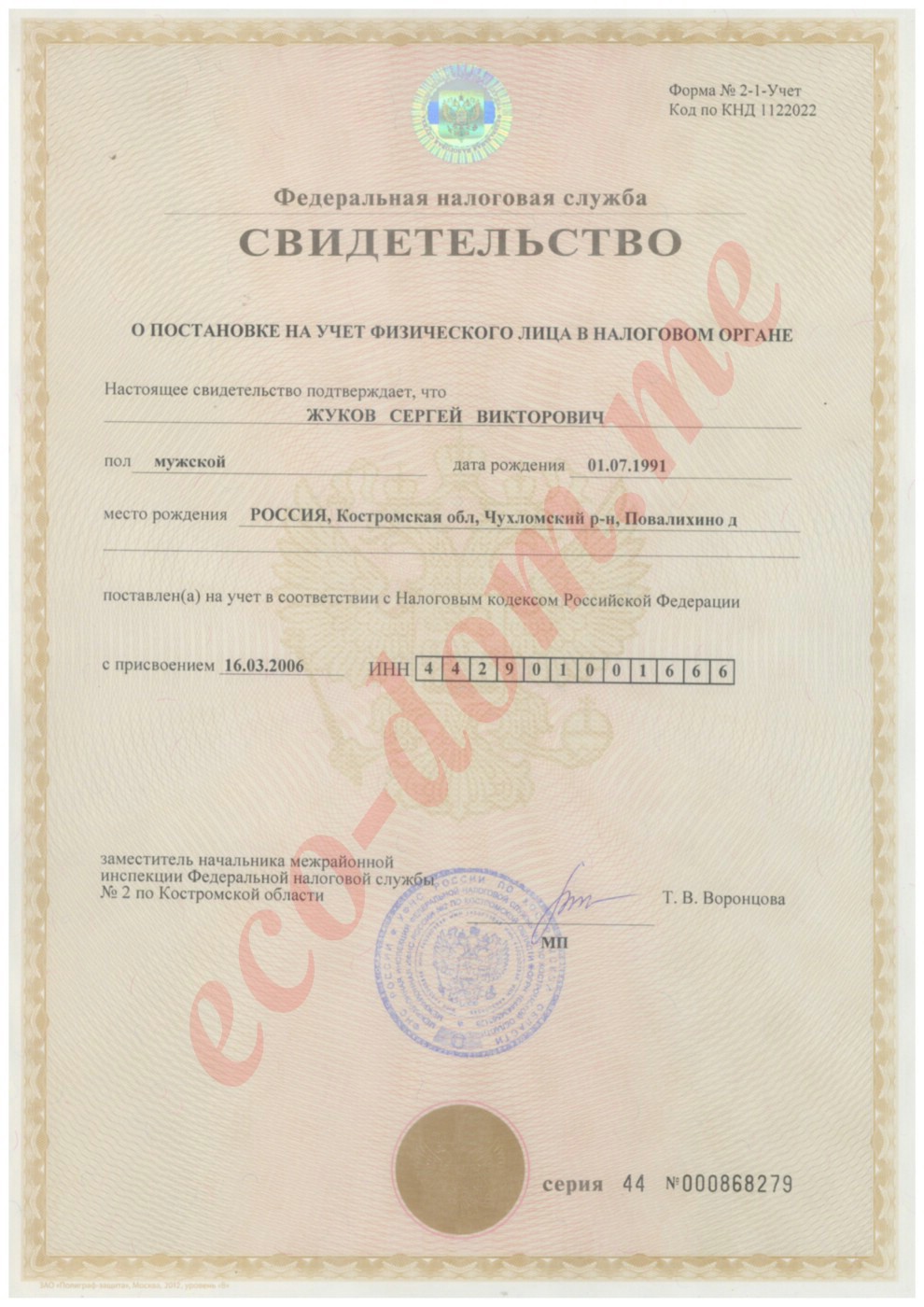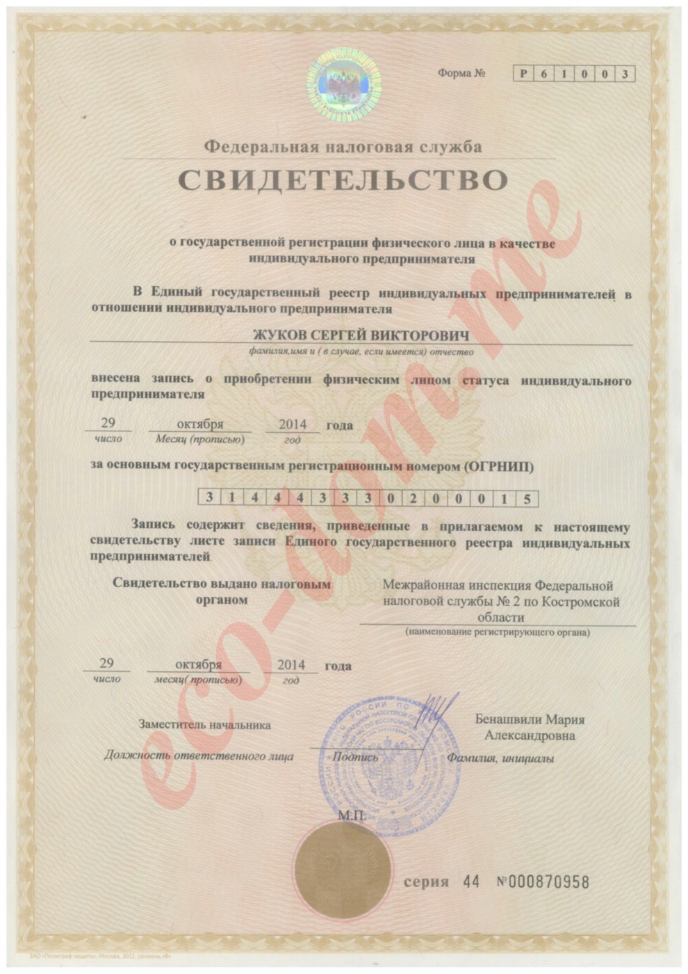 Свидетельство о государственной регистрации физического лица в качестве индивидуального предпринимателя: