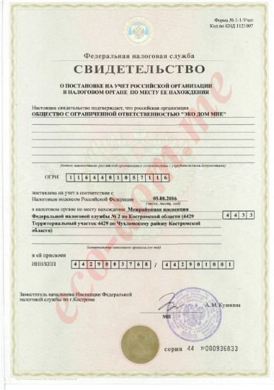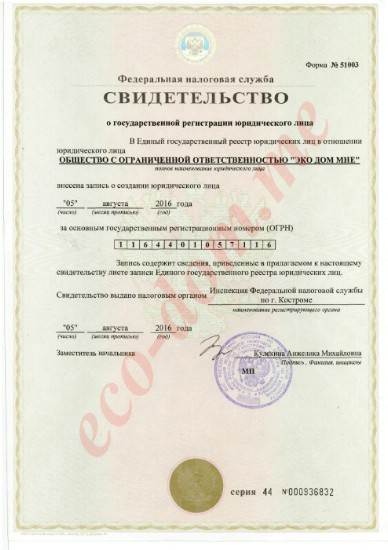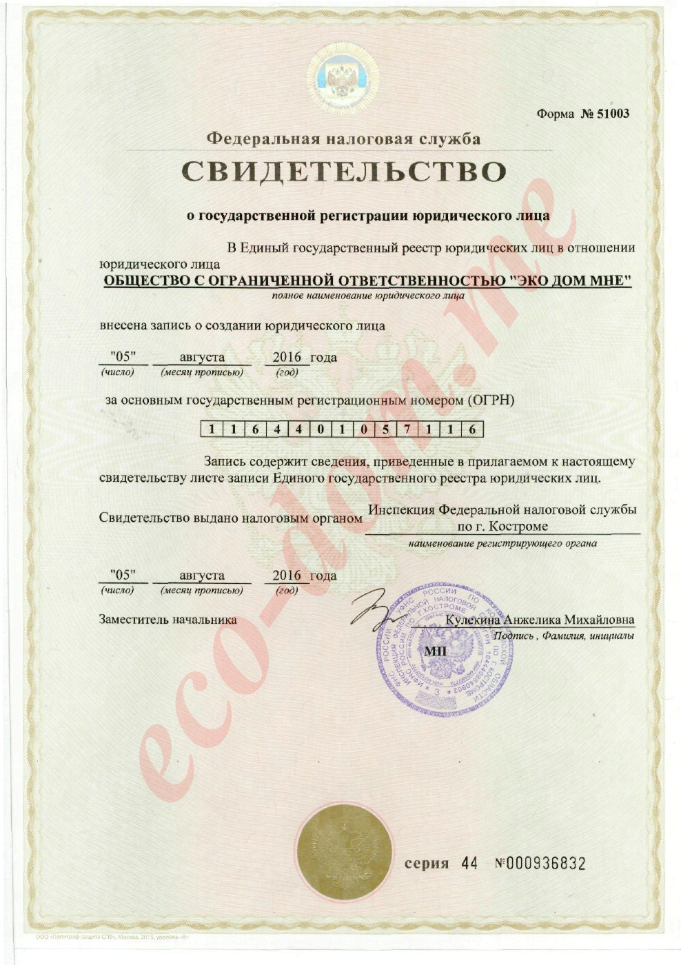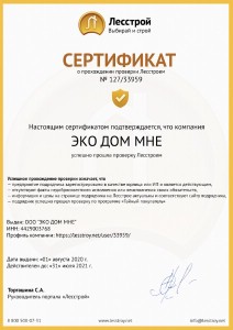 Настоящее свидетельство подтверждающее, что российская организация ООО "ЭКО ДОМ МНЕ":