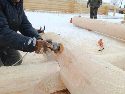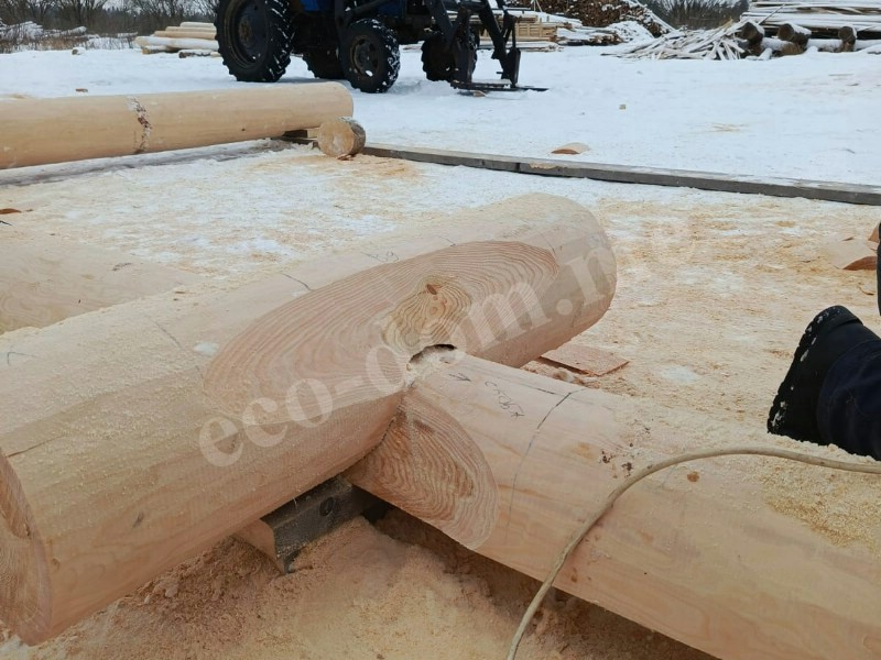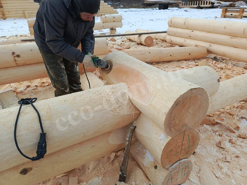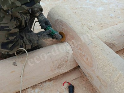 Каждое бревно размечается по шаблону. В местах пересечения бревен вырезаются угловые соединения — чаши. В канадской рубке используется замок «ласточкин хвост» с расширением внутрь. Это позволяет стыковать бревна без зазоров. Ширина чаши зависит от диаметра ствола. На этом этапе важна точность. Мастера Экодома все делают идеально, с точностью до миллиметра.