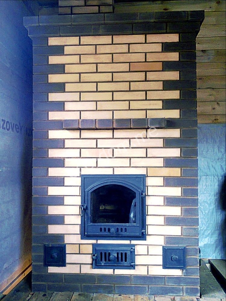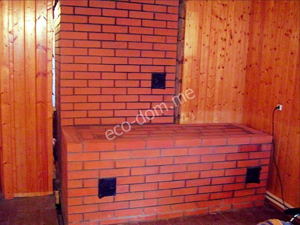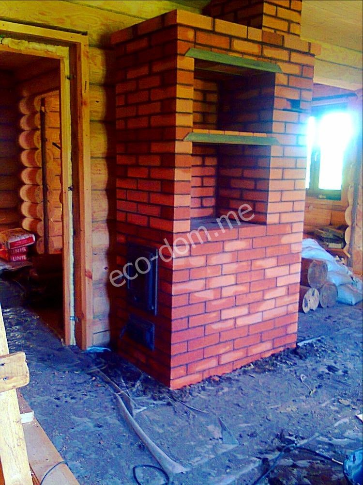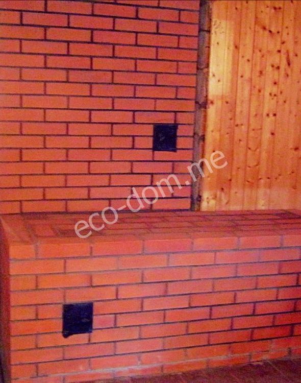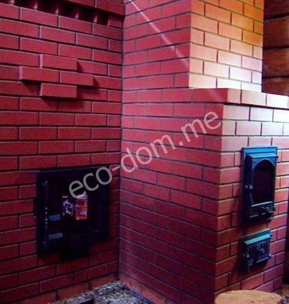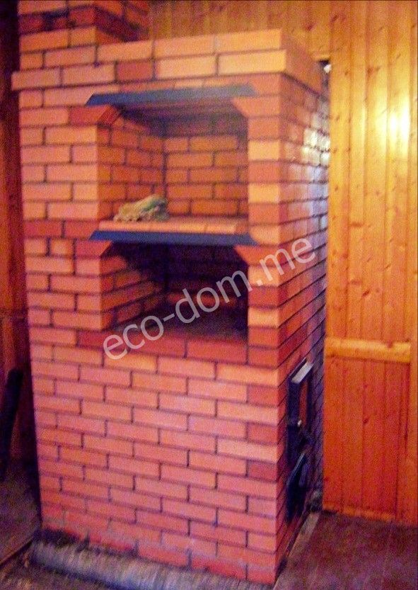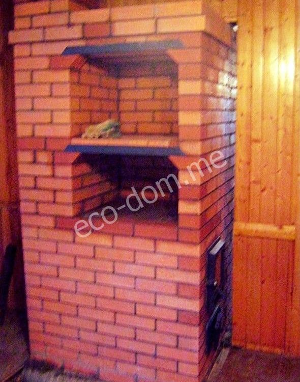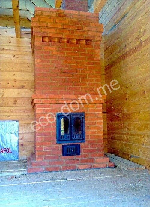 Снаружи выполнена из «Кирово-Чепецкого» кирпича, печное литьё «Везувий», внутренний сердечник из шамотного кирпича, печная смесь «Костромская». Печь хорошо подходит для отопления помещения, также. Дверка со стеклом (видно открытый огонь) создаёт атмосферу уюта. Печь можно выполнить и из «Витебского» кирпича, который дешевле, но ни значит что хуже.