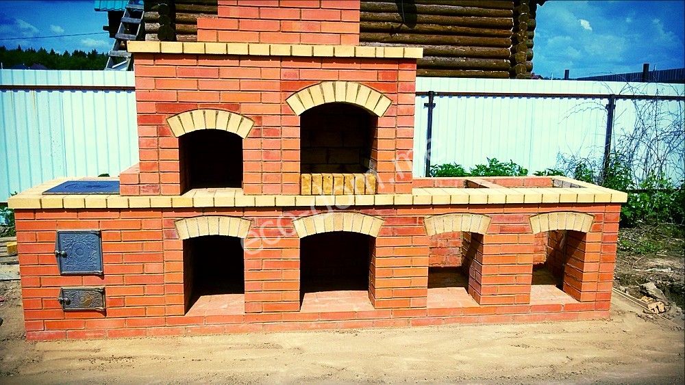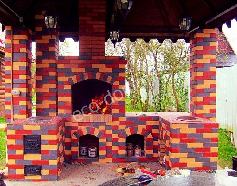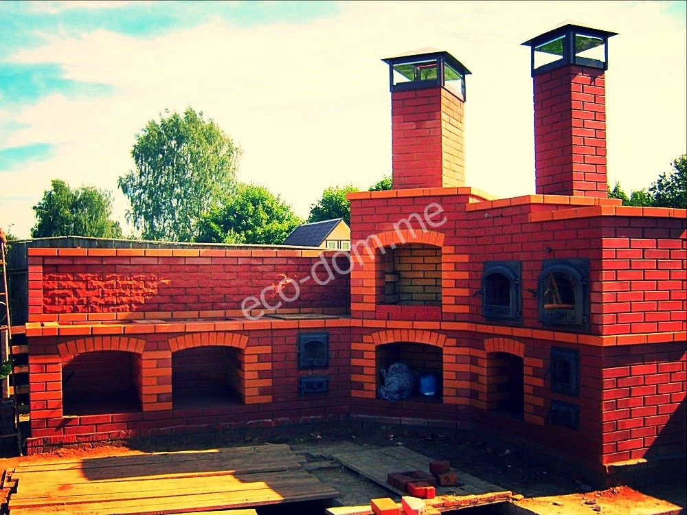Снаружи выполнена из «Витебского» кирпича, печное литьё «Везувий», внутренний сердечник, арки и пояс выполнены из шамотного кирпича, печная смесь «Костромская». Многофункциональная барбекю, есть плита для готовки, мангал для готовки на открытом огне, русская печь. Выполнить можно в разном цвете, в зависимости от выбранного вами кирпича. Стоимость за данный образец без учета фундамента.