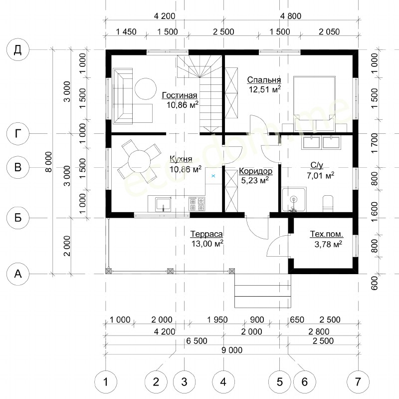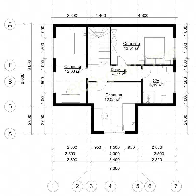 План схема Проект дома из бруса 8х9 № ДБ-63