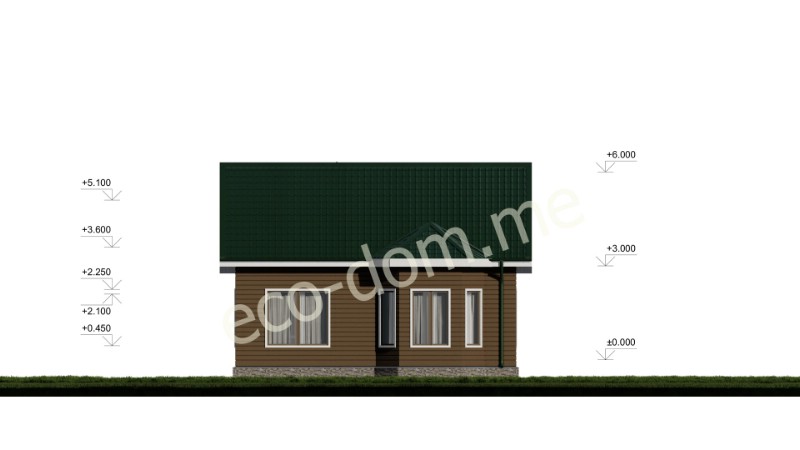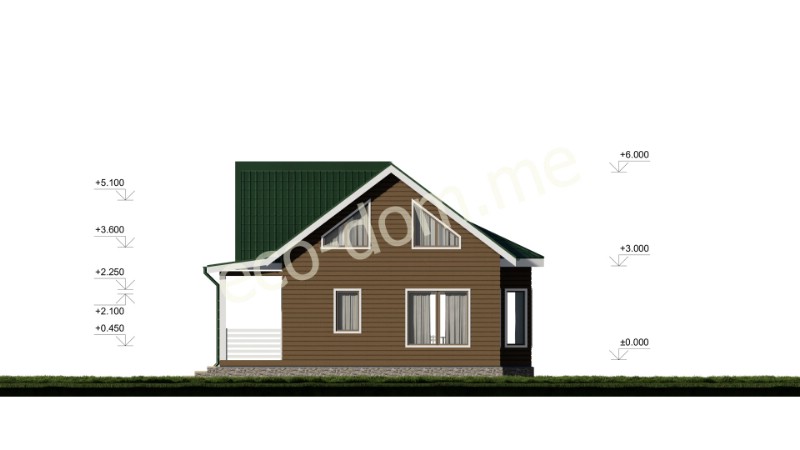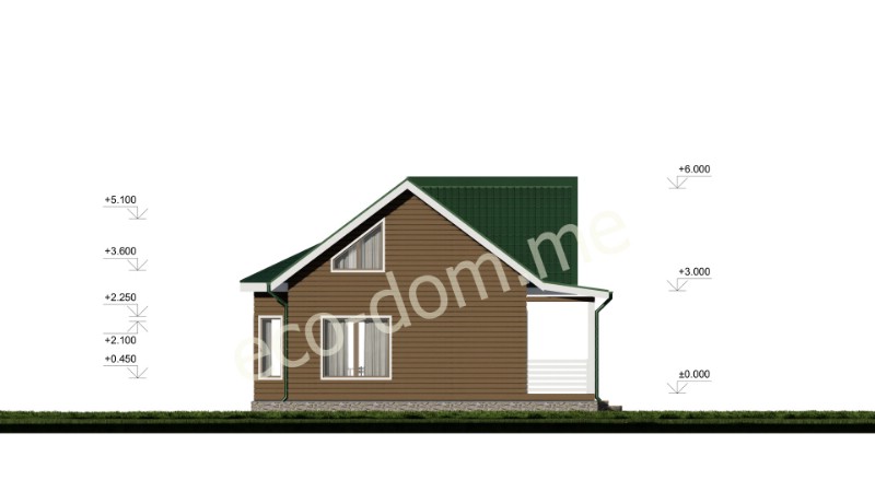 Небольшой, с крепко сбитым планом загородный дом может использоваться как для постояного проживания, так и в качестве вспомогательного сооружения в период возведения основного коттеджа. Небольшие габариты позволяют разместить его и на садовом участке. Центральным местом в доме является двусветная столовая-гостиная с печью-камином. Отсутствие подвального помещения предполагает возведение дома практически на любых грунтах.