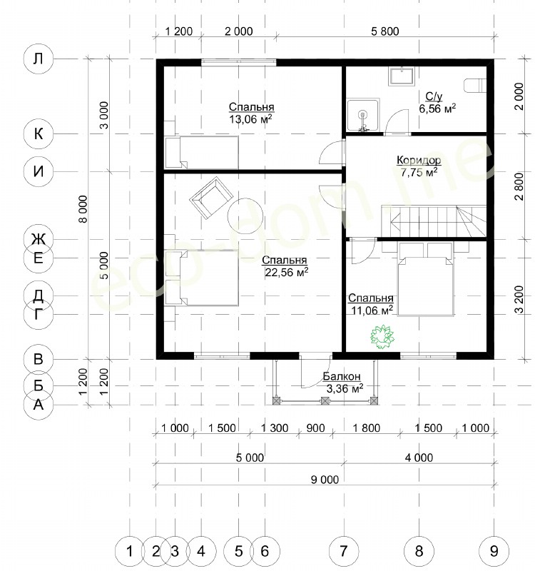 План схема Проект дома из бруса 8х9 № ДБ-74