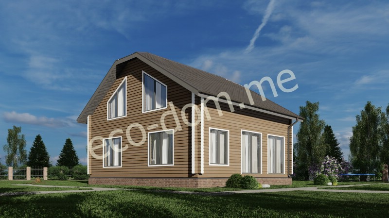 На первом этаже располагаются: веранда, гостиная-столовая, кухня, кабинет и крыльцо. На втором этаже вас ждут: комната отдыха, две спальни, санузел. Зона верхнего этажа предназначена для отдыха, а первого — для встречи гостей, развлечений и приятного времяпрепровождения. В таком уютном и просторном доме можно часто проводить семейные вечера или встречи с близкими друзьями.