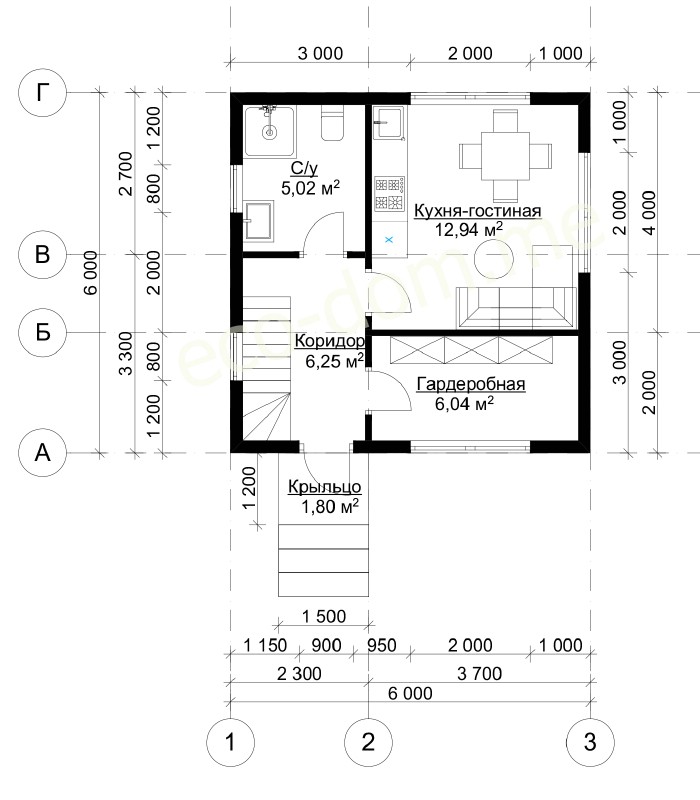 План схема Проект дома из бруса 6х6 № ДБ-55