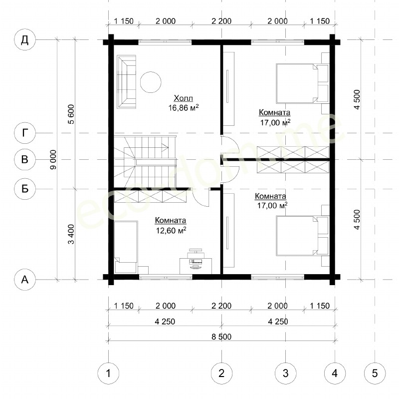 Высота наружных стен второго этажа 1,7 метра.