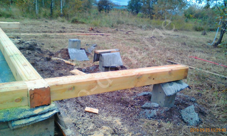 После того, как высота фундамента выведена на необходимый уровень, его выравнивают и осуществляют гидроизоляцию. В качестве гидроизоляции применяется рубероид на битумной мастике.