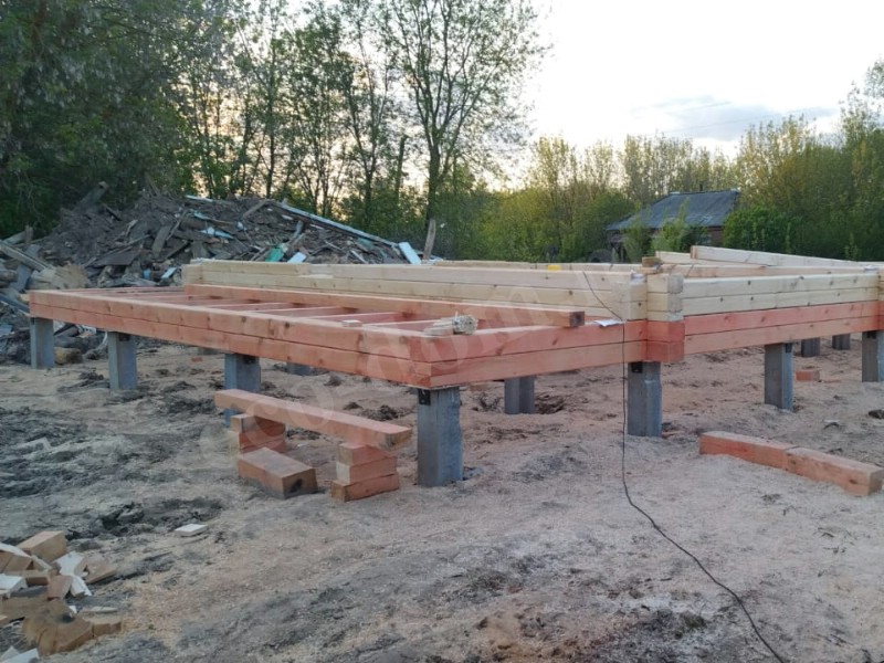 Стоит упомянуть, что главным используемым материалом строительства является строганное бревно, изготавливаемое методом ручной рубки. А в качестве основы здания мы заливаем ленточный фундамент, поскольку он: